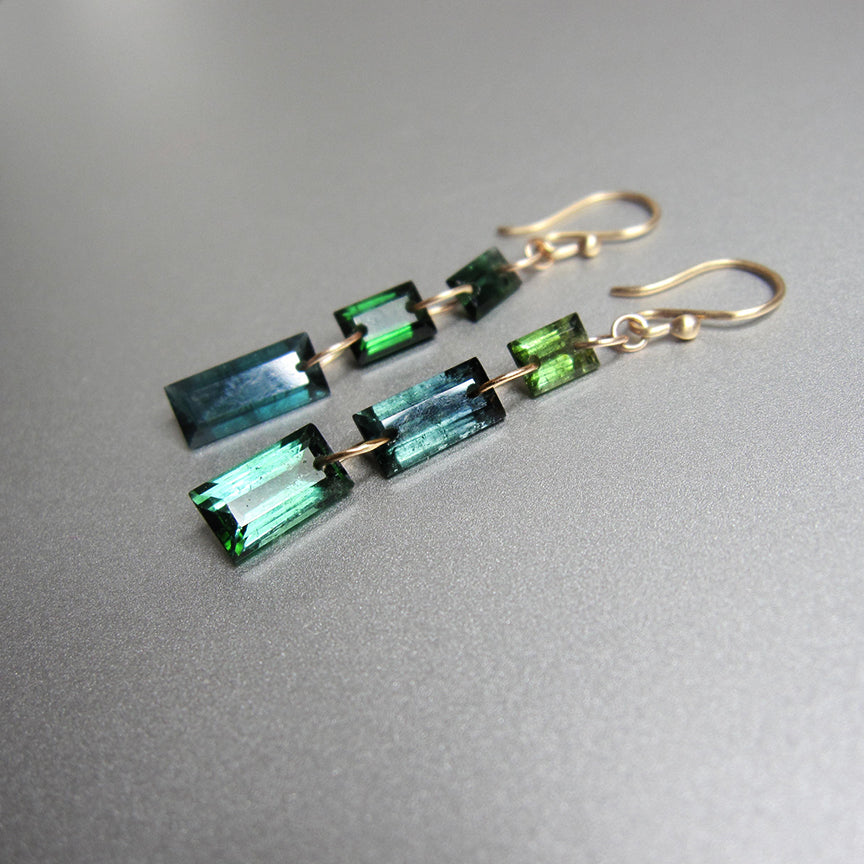 Very fine tourmaline stones in greens and blues have been linked together with soldered 14k gold rings to make up long swingy earrings. The mismatched baguettes hang from satin-finished earwires. The earrings hang 1 3/4" total.
