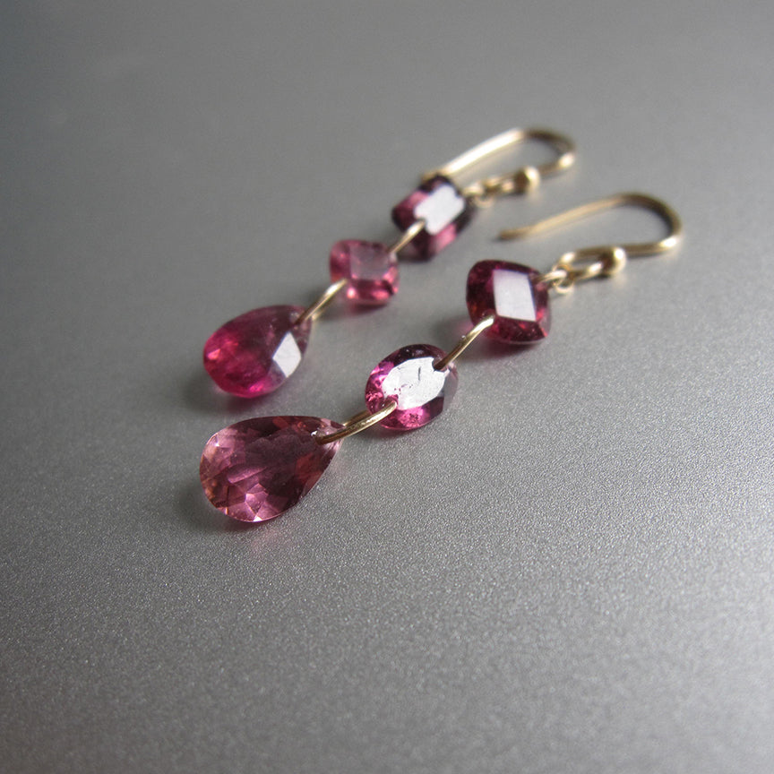 Rubellite Tourmaline, Triple Mismatched Drops, Solid 14k Gold Drop Earrings
