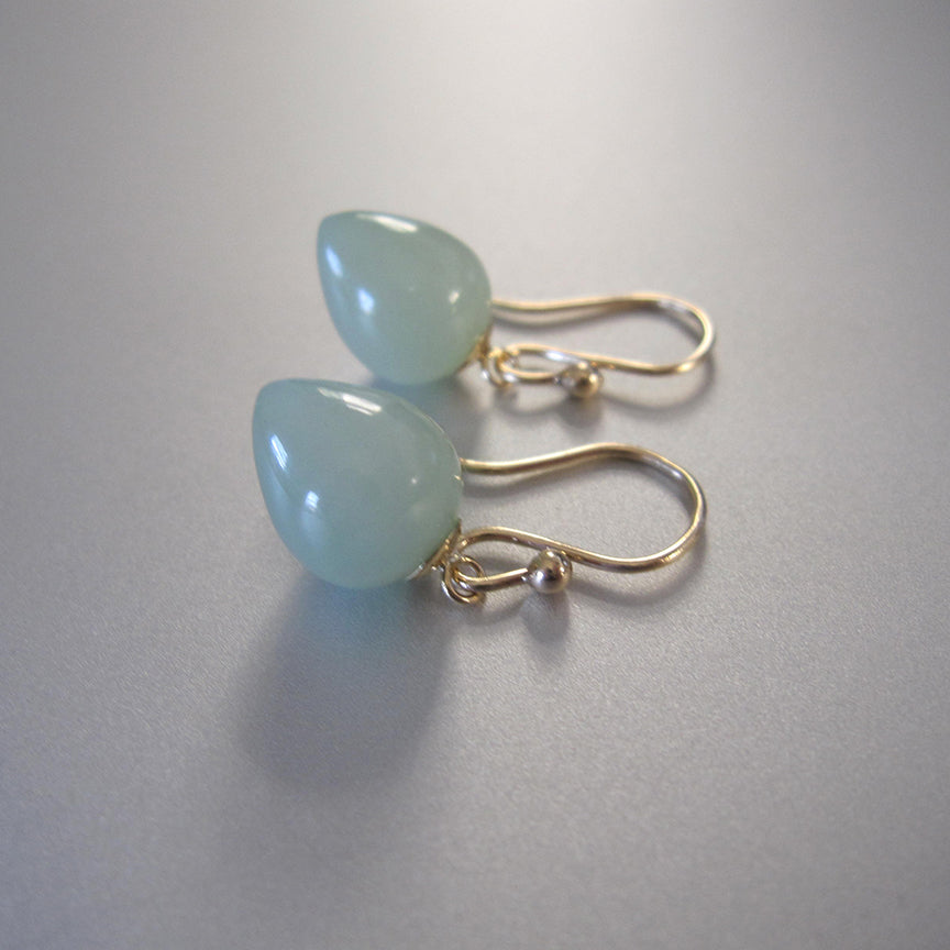 Gorgeous jade-green serpentine drops are capped in 14k gold and hung from polished gold ear wires. There is a slight cats-eye effect to these lovely drops. The stones are 12mm and the earrings hang 1" total.