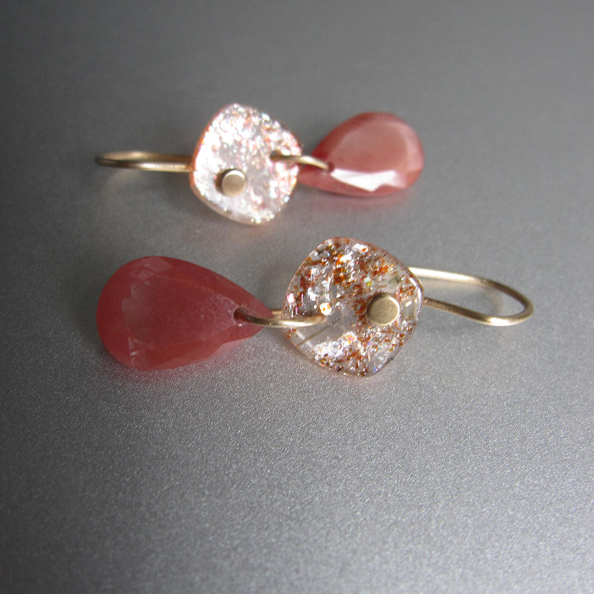 Smooth slices of glittery sunstone are linked with soldered loops to ring-cut andesine drops and hung from satin finished earwires. The sunstones flash rainbow confetti when they move and the andesine has a subtle schiller glow. The earrings hang 1 1/4" total.