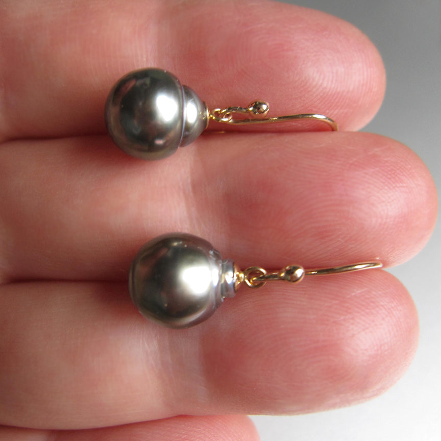 Dark gray Tahitian pearls have been hung from solid 14k yellow gold caps and ear wires. The 10mm pearls have some surface rings and blips as is common with Tahitian pearls. The earwires have been given a polished finish. The earrings hang 7/8" total.
